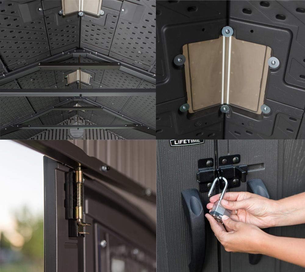 Lifetime 8-Foot wide outdoor storage sheds are the perfect solution to your storage needs. Built with durable, dual-wall high-density polyethylene, our sheds are steel-reinforced & low-maintenance. With a wide range of features including shatter proof windows, skylights, custom shelving, & much more, A Lifetime shed is the perfect addition to your backyard. Features: vertical siding, slider latch, window shutters, 3-pane doors, (1) Ridge SkyLight, (1) shatter-proof window, (2) screened vents, (1) 90 in. X 9 in. Shelf, (4) decorative corner trims, (6) wall hooks, & a 10-year limited warranty. Comes in Gray with a wood-grain Floor, installation hardware included, & comes in (2) boxes.