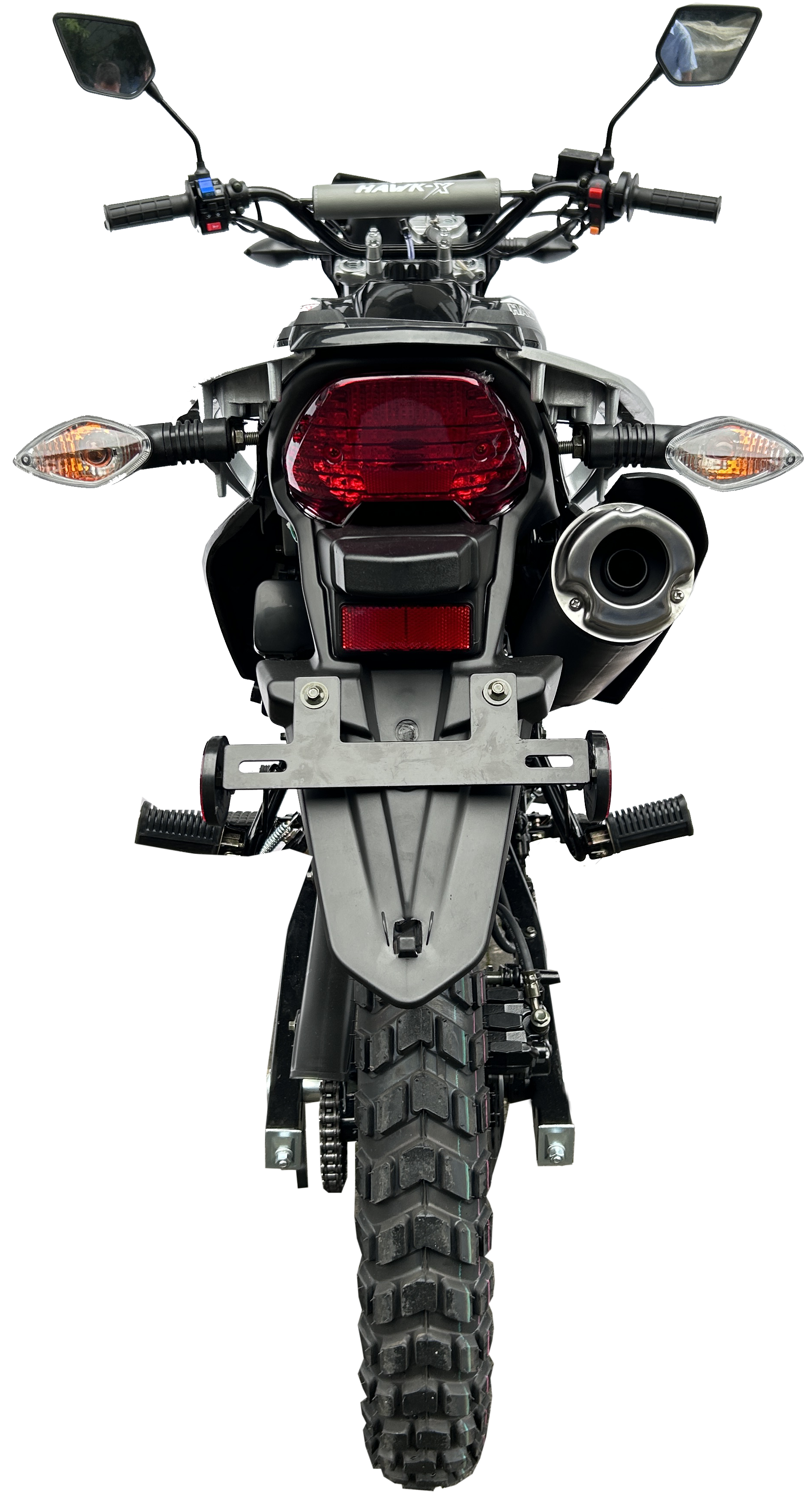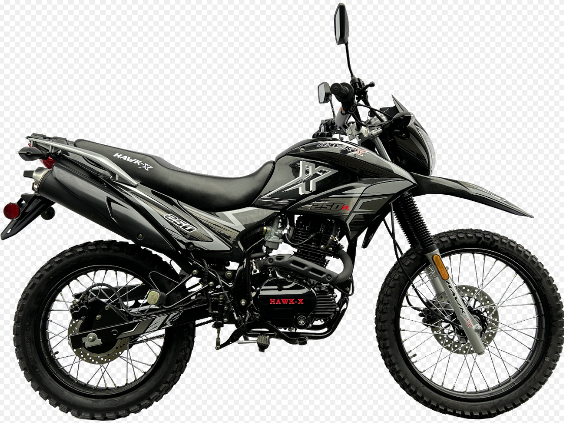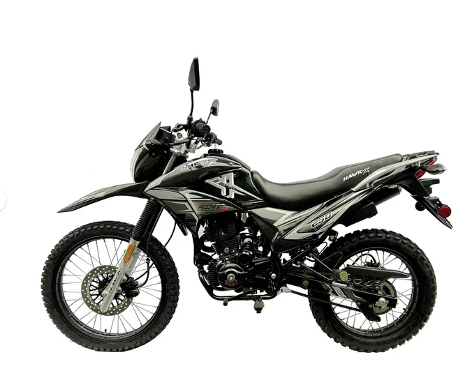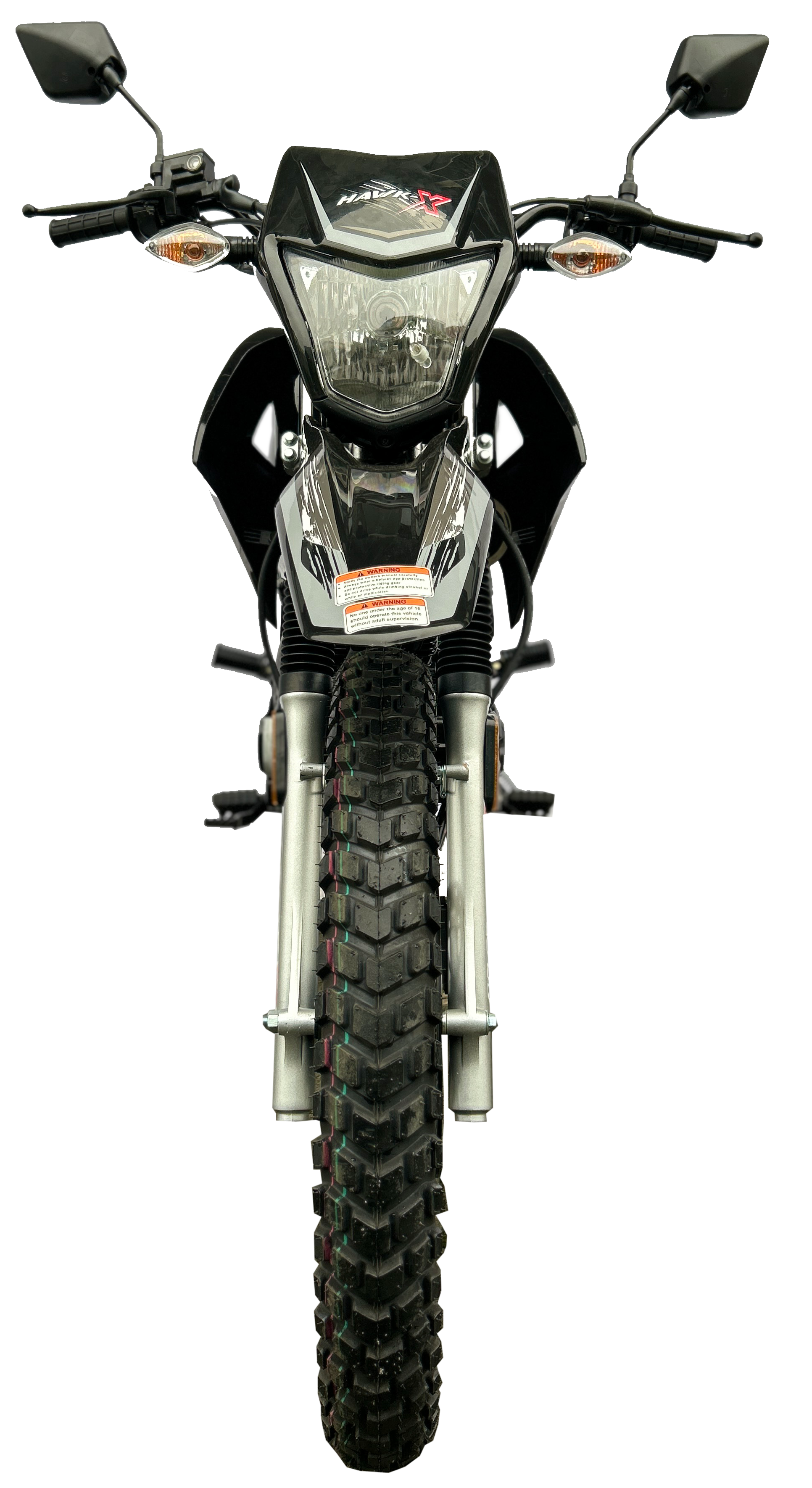 The full-size Hawk 250X. Enduro Dual Sports motorcycle has all the premium features of the famous Hawk 250 with a newly upgraded suspension. Completely street-legal. Front and rear hydraulic disc brakes and heavy-duty steel. twin-spar frame. DOT light package.