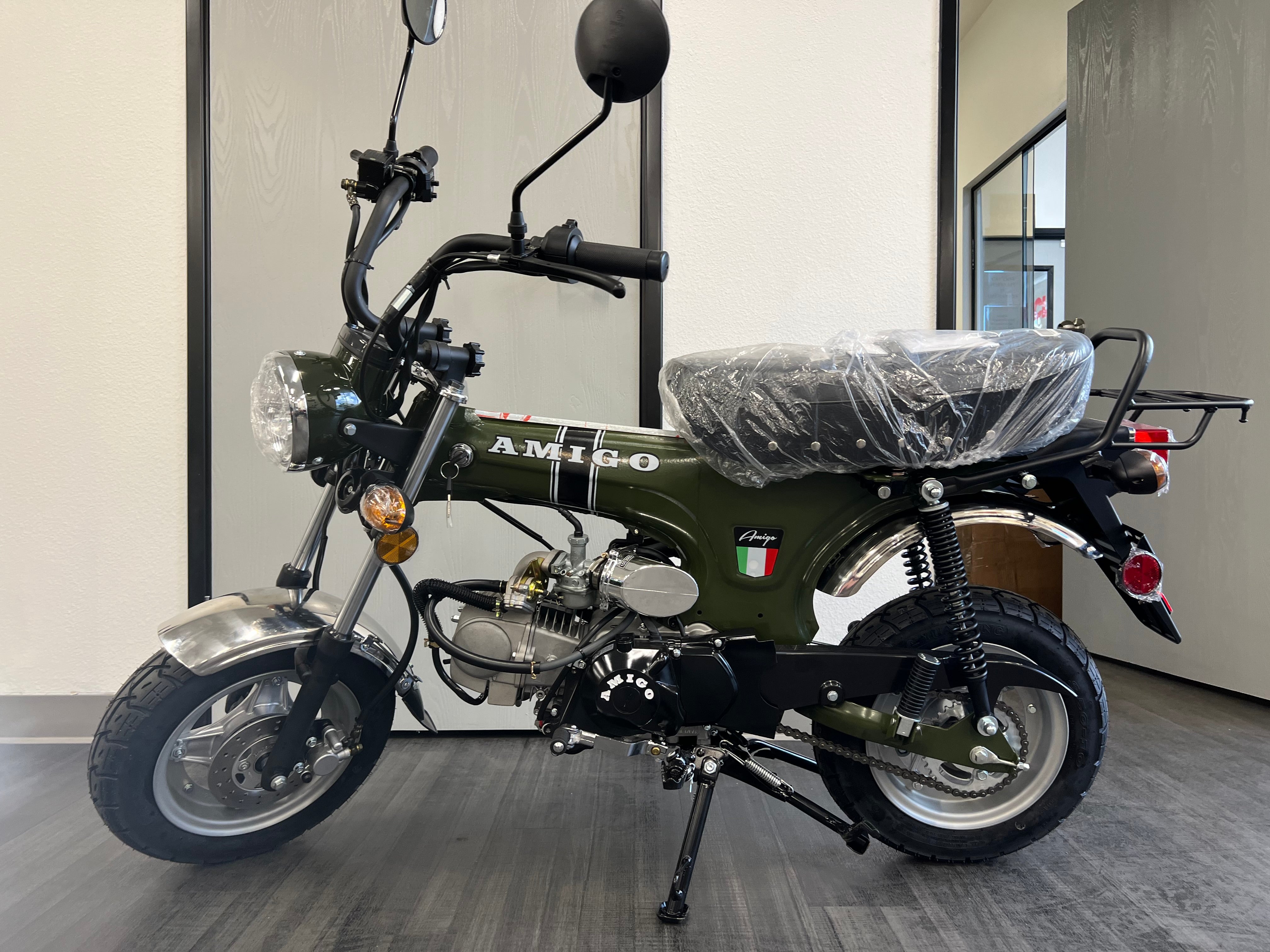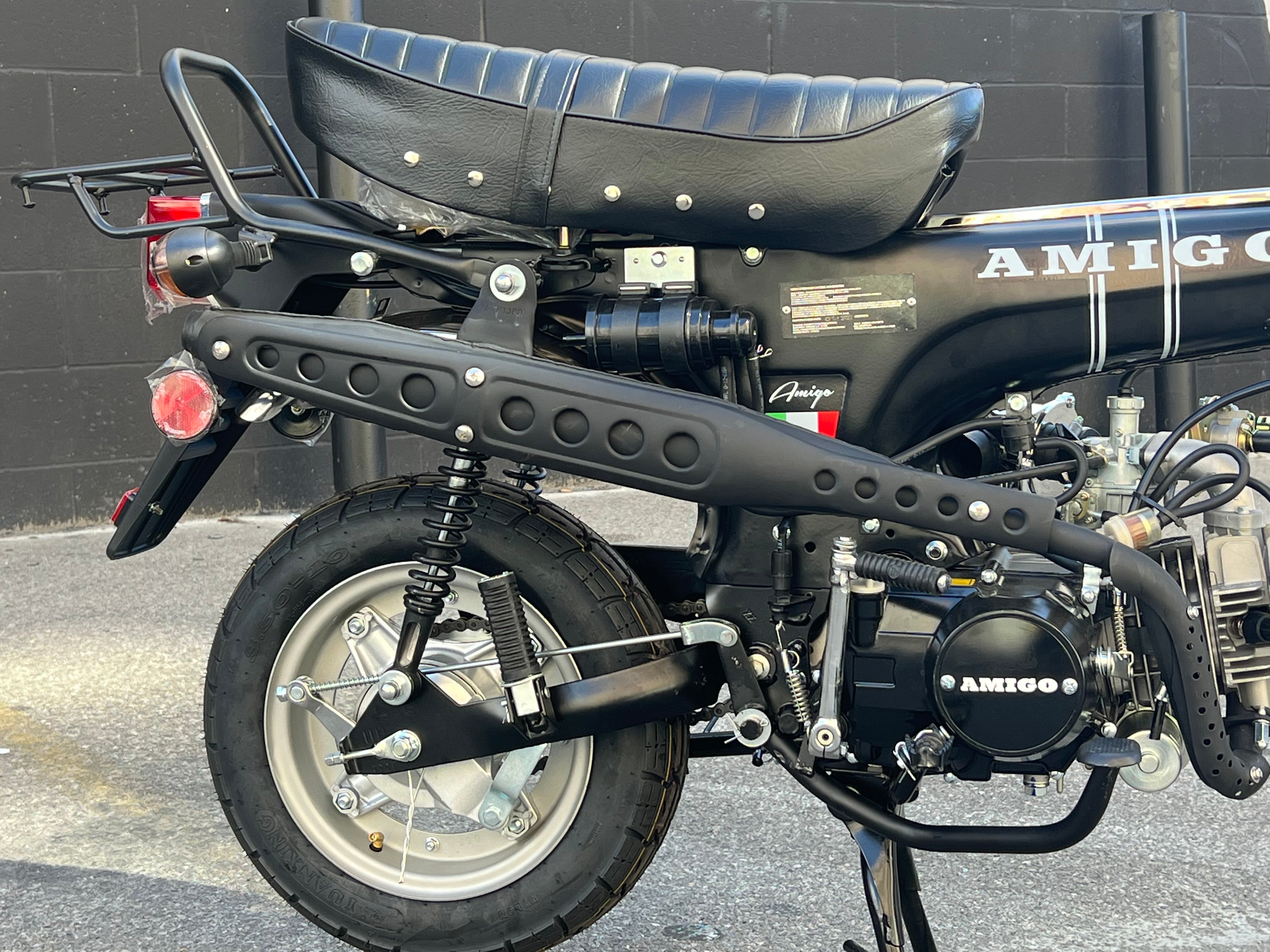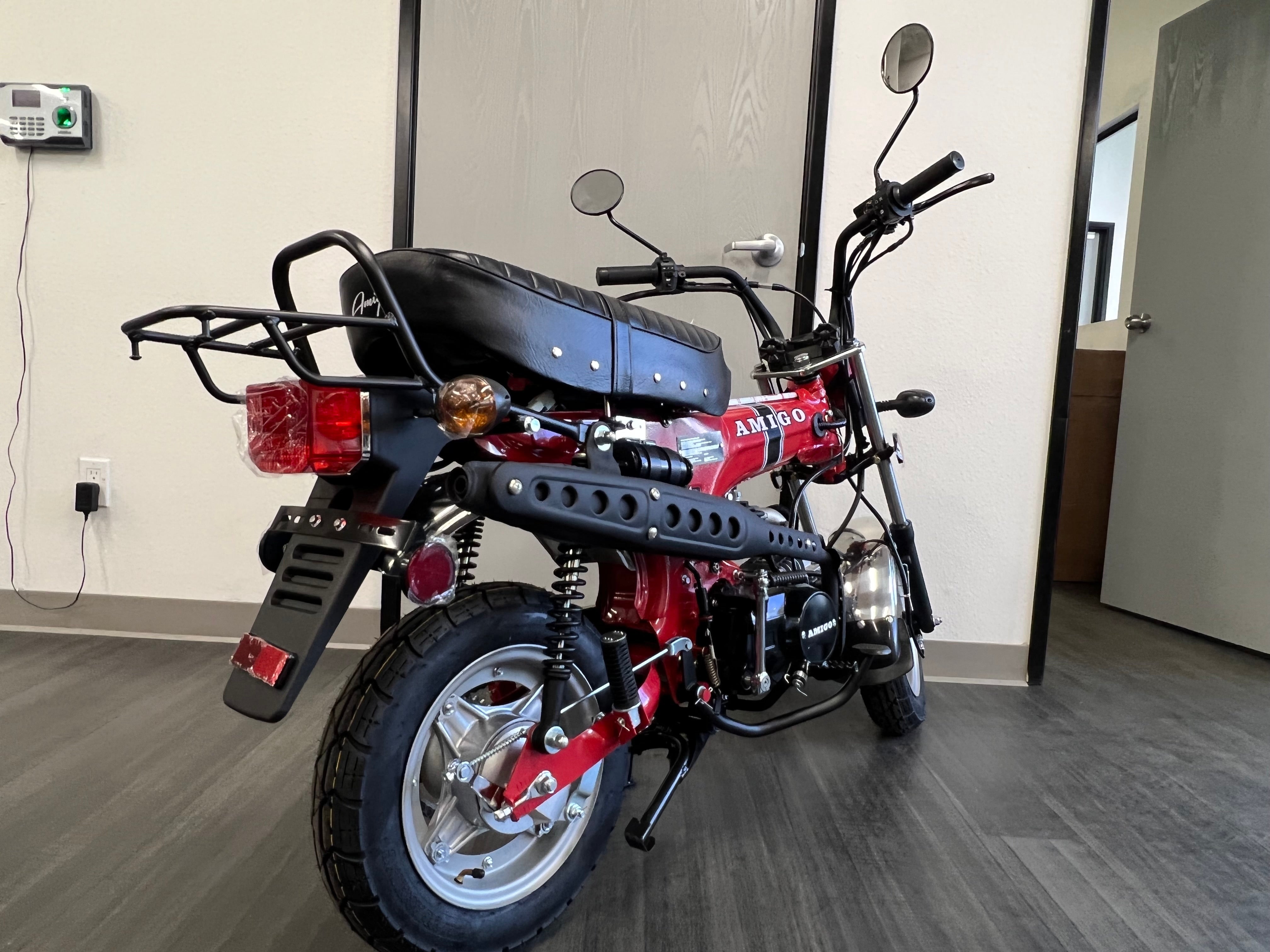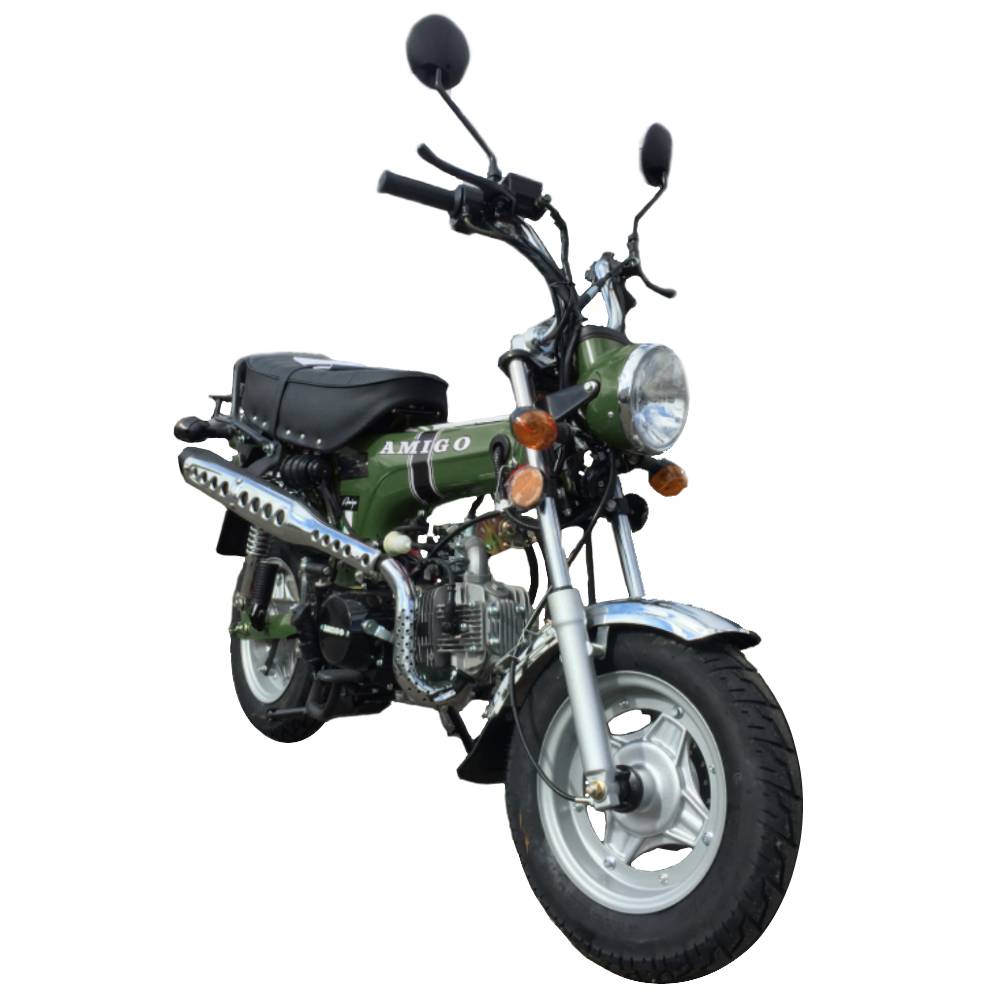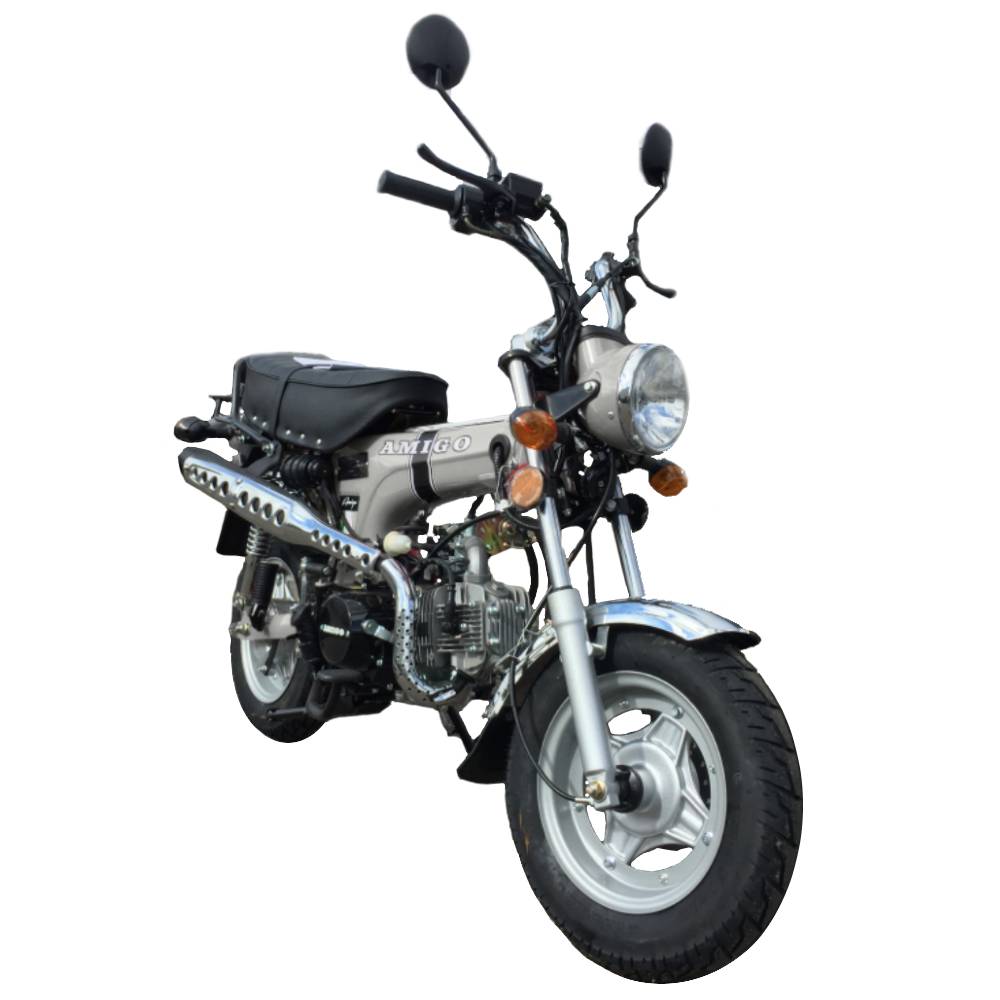 Classic Honda Trail CT70 looks with more horsepower now available from the best scooter shop in the business. This fun Tribute bike comes packed with features like 10-inch tires. 4-speed manual transmission. and dual hydraulic brakes. The Amigo Trail 125 is street Legal in all 50 states. The proven 125cc engine makes up to 6+ horsepower so there's plenty of power to take on the neighborhood or the back roads. A large padded seat gives the rider a comfortable place to ride. which considering how fun this is to ride will be a necessary upgrade. you will not want to park it for very long.