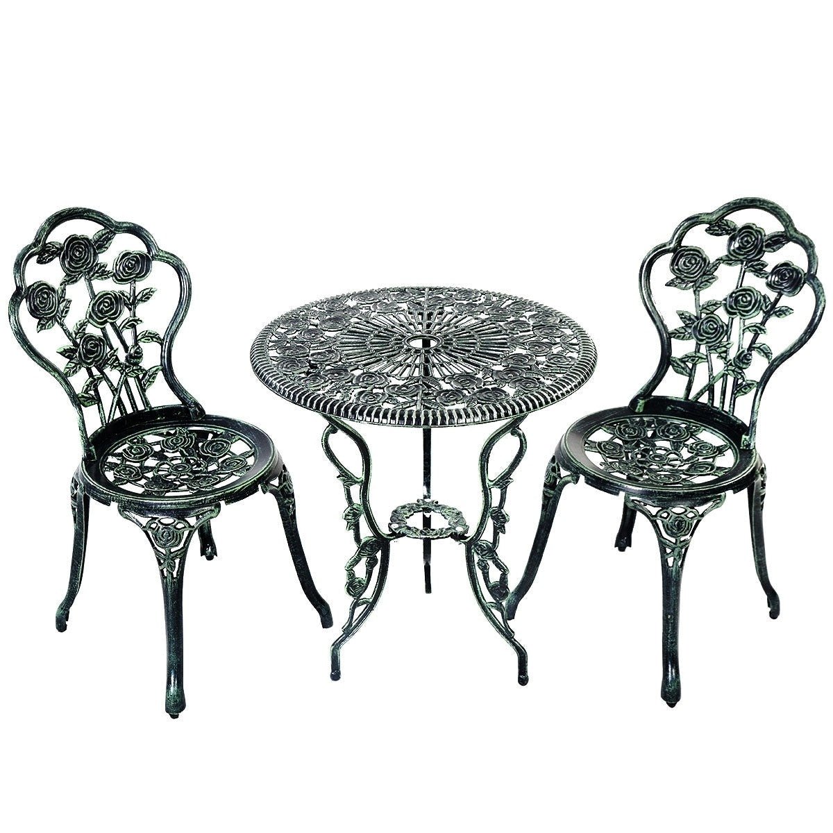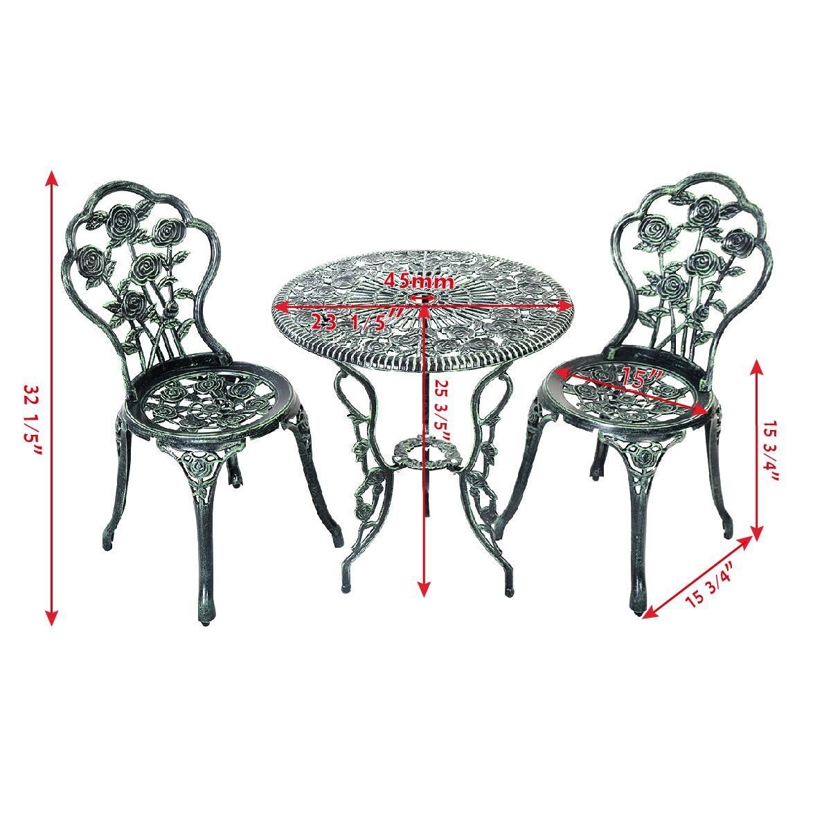 <p>This table and chairs set can be a great addition to your outdoor living space.</p> <p> </p> <p>Made of durable aluminum the table and chairs set can have a long service time. The feet pads are provided to make the table and chairs stable. In the middle of the table a parasol hole is used for holding an umbrella to shade you from sunshine and rain.</p> <p> </p> <p>The furniture set with attractive antique finish will decorate your garden or yard. Do not hesitate to buy it!</p> <p> </p> <ul> <li>High quality</li> <li>Attractive antique finish</li> <li>Beautiful design with rose detail</li> <li>Sturdy and comfortable</li> <li>Stable with wide leg positioning</li> <li>Includes a 45 mm umbrella hole</li> <li>Includes one table and two chairs</li> <li>Assembly required and instruction included</li> </ul><ul> <li>Material: Cast aluminum (table top and chair backrest) cast iron (table legs chair seat and chair leg)</li> <li>Table size: 23 1/5" x 25 3/5" (Diameter x H)</li> <li>Chair size: 15" x 15 3/4" (Diameter x H) (from floor to seat)</li> <li>Package includes:</li> <li>2 x Chairs</li> <li>1 x Table</li> </ul>