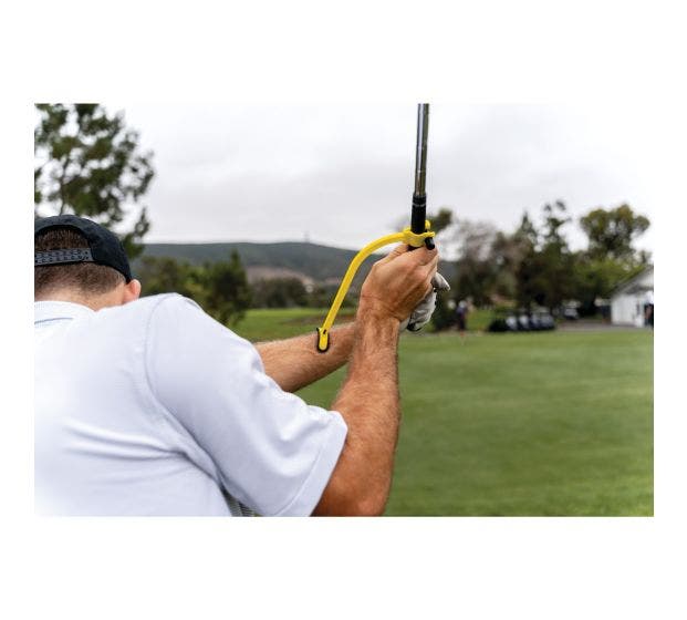 The Hinge Trainer is designed to help set the correct hinge position at the top of your backswing. The training aid is made to help promote setting the wrist early for proper clubface alignment and consistent on-plane swings for improved game on the course. The innovative swing lock mechanism was built for easy setup, adjustments, and club changes.