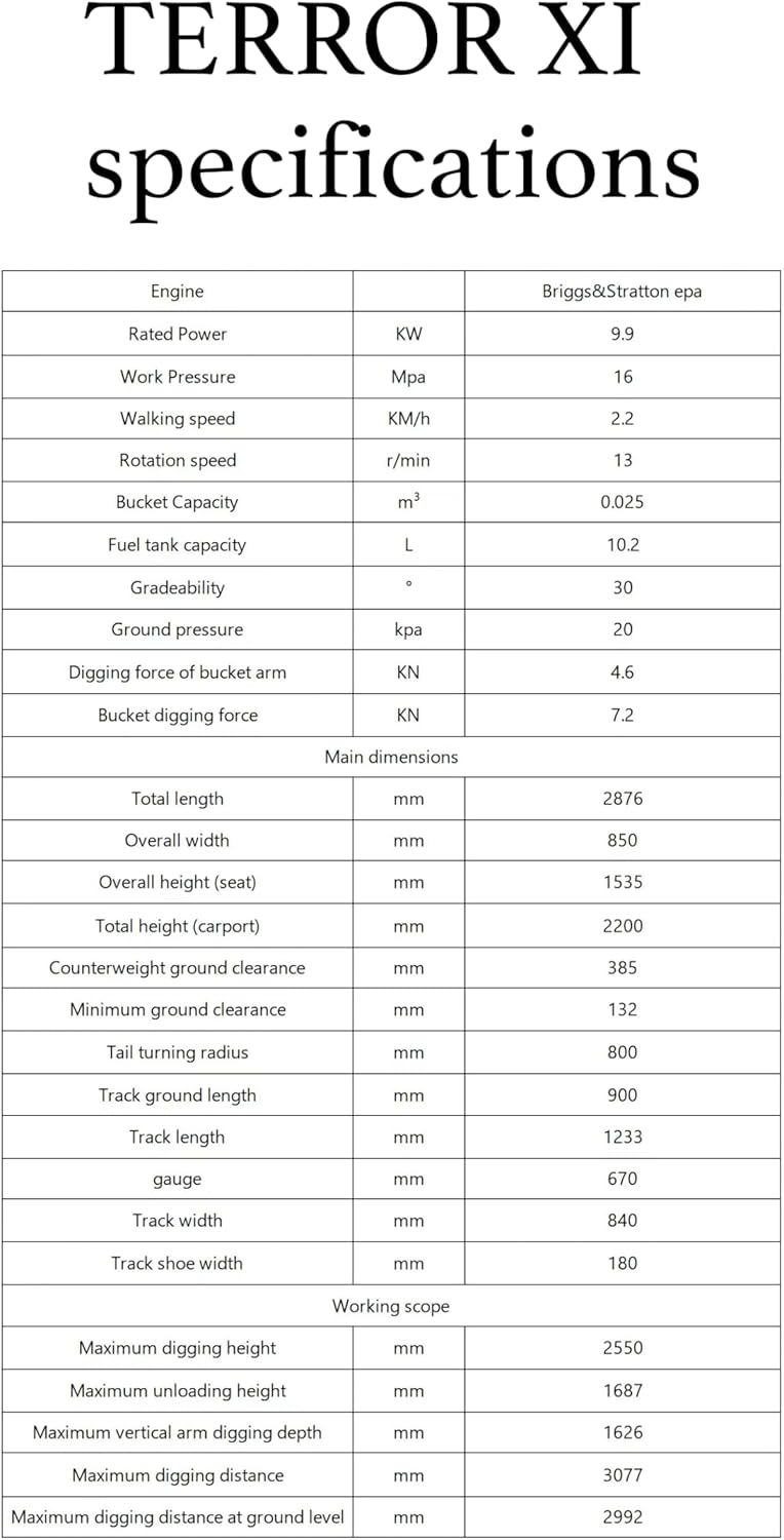 - 4. User-Friendly Design Micro digger is extremely easy to maneuver, even for first-time users. Comes with a boom swing for extra agility. Possesses a maximum digging height of 2550mm and maximum excavation depth of 1626mm. 400mm bucket with a capacity of 0.025cbm and platform ground clearance of 132mm allow easy operation for all excavation, drilling, or bull-dozing jobs.
