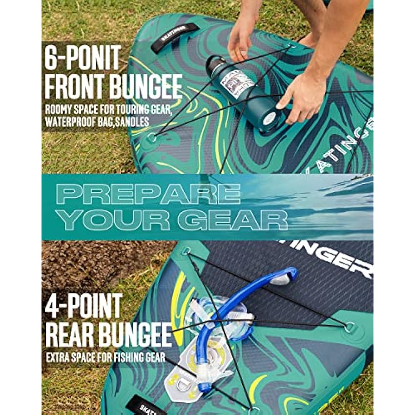 - 【CARGO STORAGE WITH DUAL BUNGEE SYSTEM】Skatinger SUP board features a dual bungee system: a 6-point bungee at the front and a 4-point bungee at the rear, providing ample space for gear like dry bags, jackets, coolers, or fishing equipment. This system is ideal for keeping everything secure and easily accessible during fishing, long-distance paddling, or day trips.