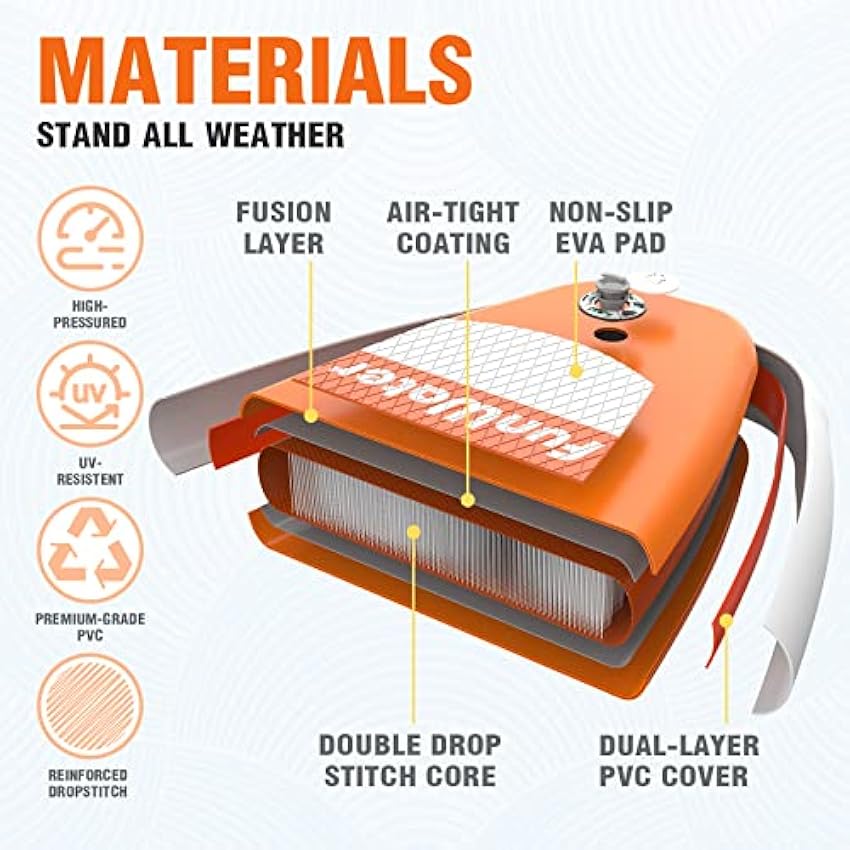- 【Design and Use】Funwater's unique ergonomic handle design allows you to inflate your paddle more easily in a shorter time. The sensitive barometer ensures that you can read the sup inflation pressure value (12-15psi) at any time. The multifunctional elastic string can tightly fix any objects placed on the inflatable paddleboard. The multipurpose and ultra-large backpack can help you easily carry the paddle to any of your dream places.
