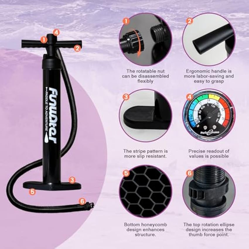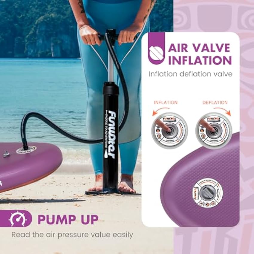 - 【Design and Use】Funwater's unique ergonomic handle design allows you to inflate your paddle more easily in a shorter time. The sensitive barometer ensures that you can read the sup inflation pressure value (12-15psi) at any time. D-rings along the side allow you clip in a chair for sit on top use.