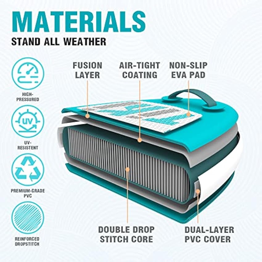 - 【Materials and Parameters】The new ultra light military grade double wall PVC is 35% lighter than similar size products (19 pounds), with excellent wear resistance, toughness and long service life. The inflatable paddleboards standard size is 10’6 ×33"×6", carrying 330 pounds.