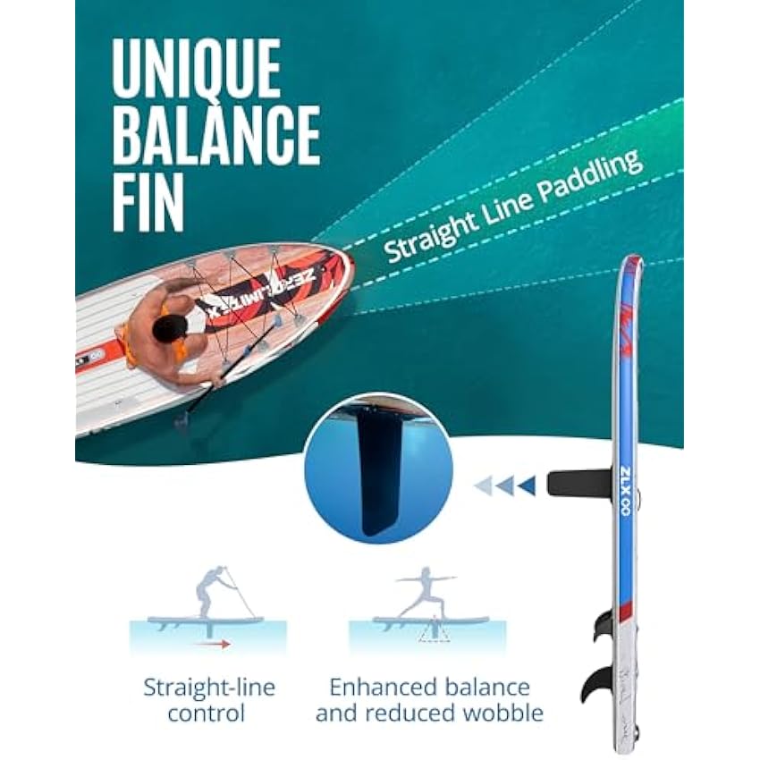 - 【Patented Surf-steady & Unbeatable Control】A game-changer for your water adventures! Engineered with exclusive StabilTrac Balance Fin and 3 fins, ZLX paddle board delivers 30% better tracking accuracy and all-level stability for beginners, dramatically minimizing sideways drift on inflatable paddle boards. Unlike generic fins, ZLX center stabilizer acts as an underwater anchor, reducing wobbles while keeping turns agile.