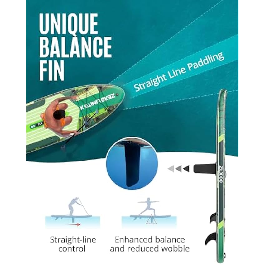 - 【Patented Surf-steady & Unbeatable Control】A game-changer for your water adventures! Engineered with exclusive StabilTrac Balance Fin and 3 fins, ZLX paddle board delivers 30% better tracking accuracy and all-level stability for beginners, dramatically minimizing sideways drift on inflatable paddle boards. Unlike generic fins, ZLX center stabilizer acts as an underwater anchor, reducing wobbles while keeping turns agile.