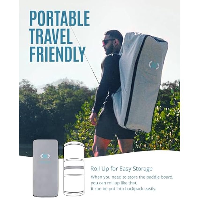 - 【ULTIMATE PORTABILITY】: This blow-up paddle board rolls into a lightweight backpack (included) for hands-free hiking to remote lakes and coastal beaches – 30% more compact than wooden boards. Fits effortlessly in car trunks or apartment closets, with rapid inflation (Upgraded pump included) ready for lake adventures and beach days in under 8 minutes